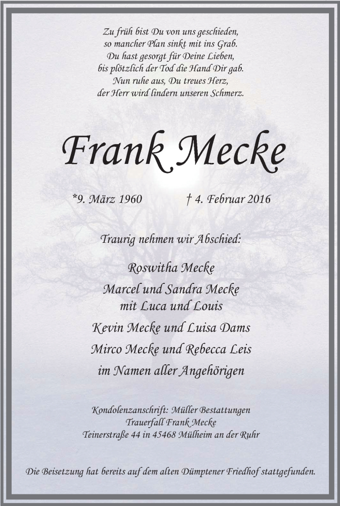Pflanzen Sie einen Gedenkbaum für Frank Mecke