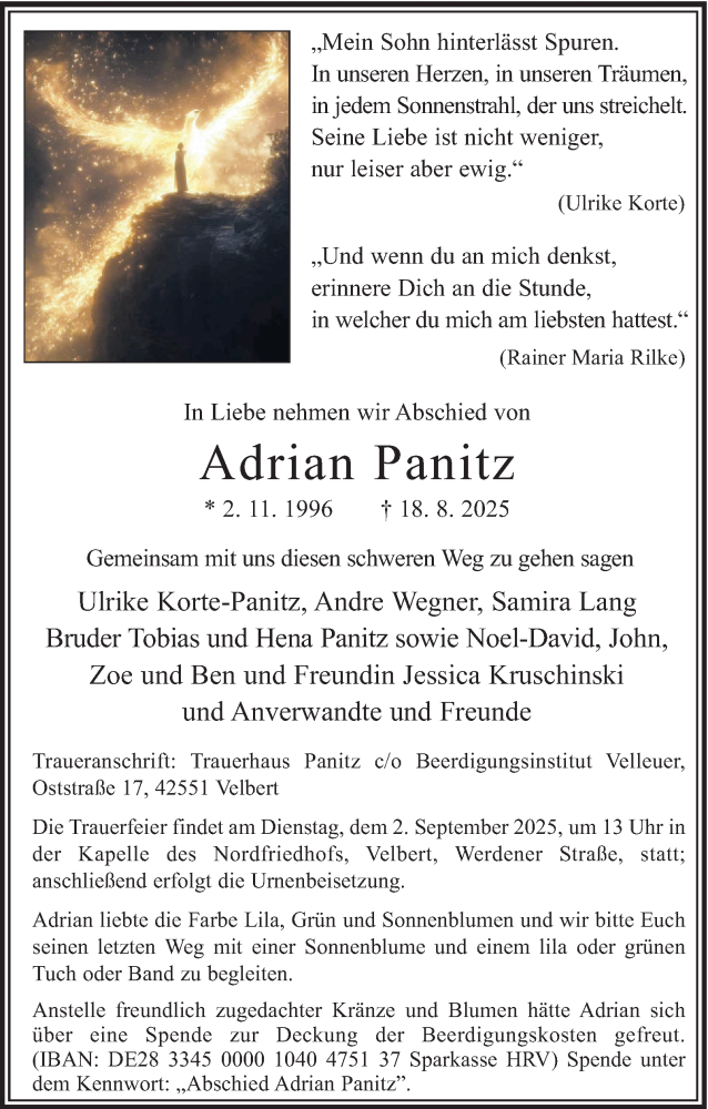 Hier finden Sie alle Traueranzeigen aus der Zeitung, die bisher für Adrian Panitz erschienen sind. Weitere Traueranzeigen, die in der Zeitung erscheinen, werden hier ebenfalls aufgelistet