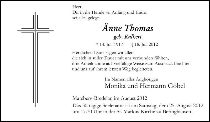 Hier finden Sie alle Traueranzeigen aus der Zeitung, die bisher für Änne Thomas erschienen sind. Weitere Traueranzeigen, die in der Zeitung erscheinen, werden hier ebenfalls aufgelistet