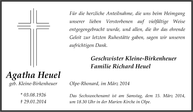 Hier finden Sie alle Traueranzeigen aus der Zeitung, die bisher für Agatha Heuel erschienen sind. Weitere Traueranzeigen, die in der Zeitung erscheinen, werden hier ebenfalls aufgelistet