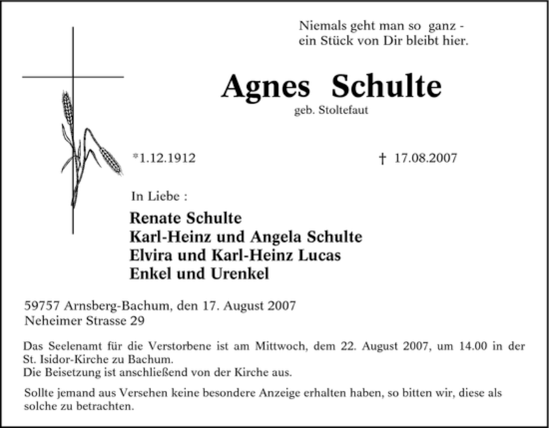 Hier finden Sie alle Traueranzeigen aus der Zeitung, die bisher für Agnes Schulte erschienen sind. Weitere Traueranzeigen, die in der Zeitung erscheinen, werden hier ebenfalls aufgelistet