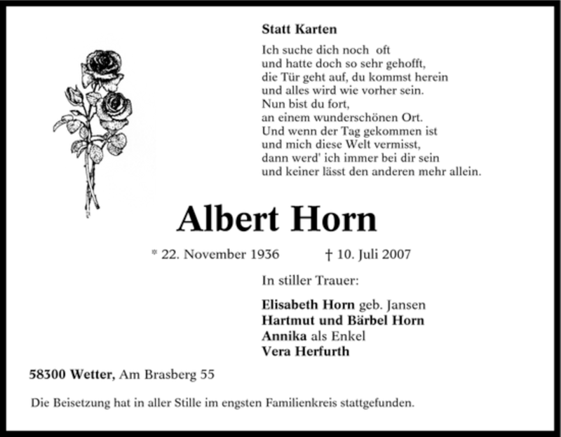 Hier finden Sie alle Traueranzeigen aus der Zeitung, die bisher für Albert Horn erschienen sind. Weitere Traueranzeigen, die in der Zeitung erscheinen, werden hier ebenfalls aufgelistet