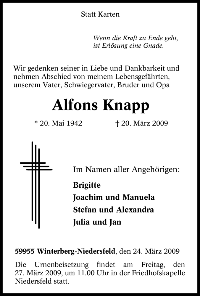 Hier finden Sie alle Traueranzeigen aus der Zeitung, die bisher für Alfons Knapp erschienen sind. Weitere Traueranzeigen, die in der Zeitung erscheinen, werden hier ebenfalls aufgelistet
