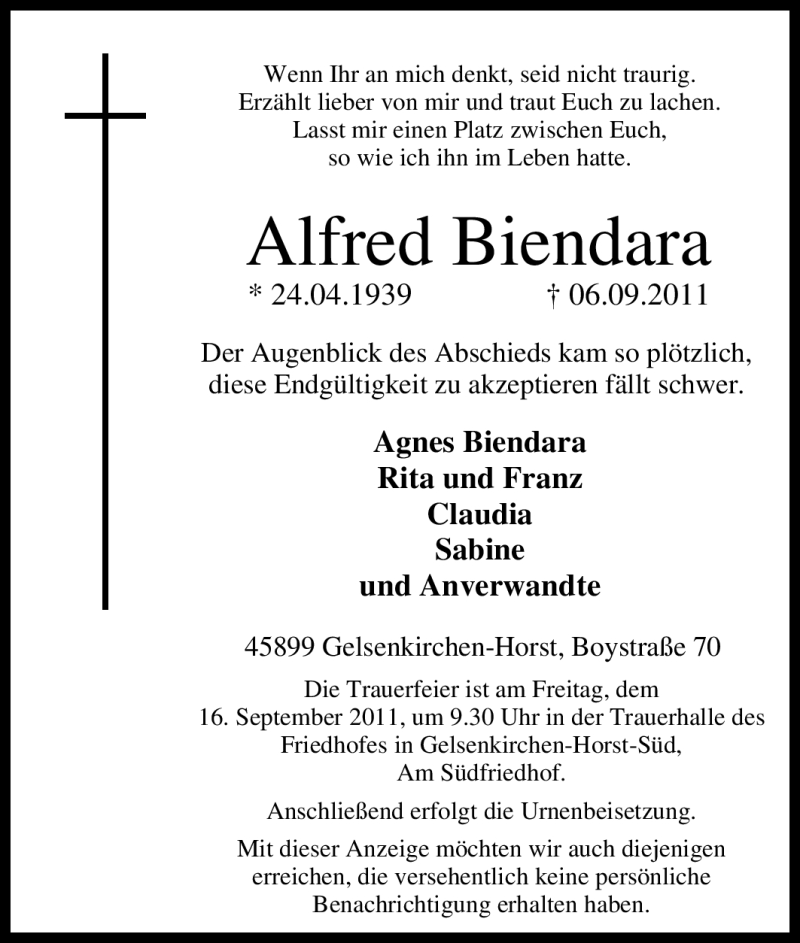 Hier finden Sie alle Traueranzeigen aus der Zeitung, die bisher für Alfred Biendara erschienen sind. Weitere Traueranzeigen, die in der Zeitung erscheinen, werden hier ebenfalls aufgelistet