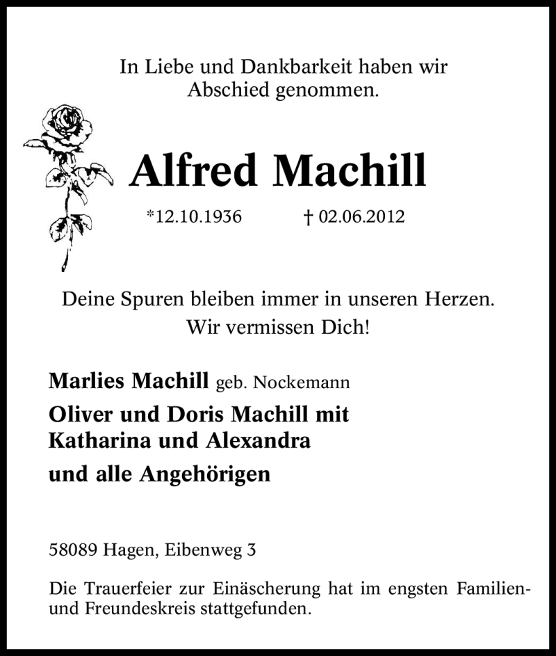 Hier finden Sie alle Traueranzeigen aus der Zeitung, die bisher für Alfred Machill erschienen sind. Weitere Traueranzeigen, die in der Zeitung erscheinen, werden hier ebenfalls aufgelistet