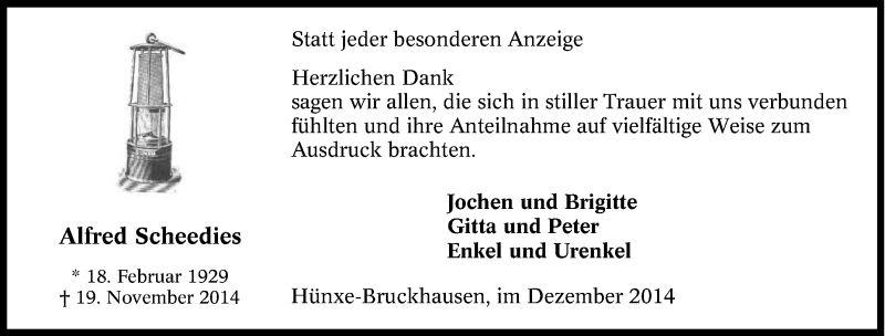 Hier finden Sie alle Traueranzeigen aus der Zeitung, die bisher für Alfred Scheedies erschienen sind. Weitere Traueranzeigen, die in der Zeitung erscheinen, werden hier ebenfalls aufgelistet