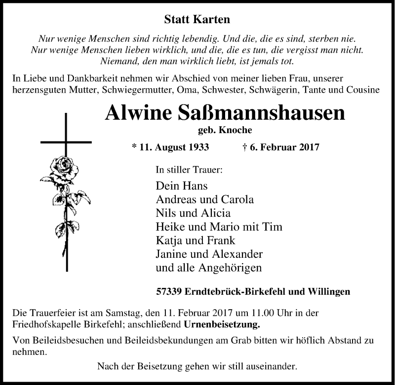 Hier finden Sie alle Traueranzeigen aus der Zeitung, die bisher für Alwine Saßmannshausen erschienen sind. Weitere Traueranzeigen, die in der Zeitung erscheinen, werden hier ebenfalls aufgelistet