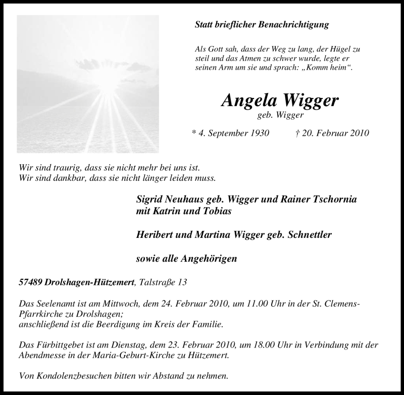 Hier finden Sie alle Traueranzeigen aus der Zeitung, die bisher für Angela Wigger erschienen sind. Weitere Traueranzeigen, die in der Zeitung erscheinen, werden hier ebenfalls aufgelistet