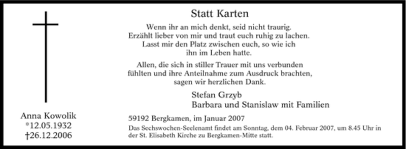 Hier finden Sie alle Traueranzeigen aus der Zeitung, die bisher für Anna Kowolik erschienen sind. Weitere Traueranzeigen, die in der Zeitung erscheinen, werden hier ebenfalls aufgelistet
