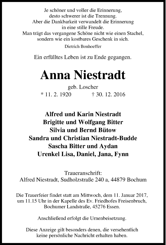 Hier finden Sie alle Traueranzeigen aus der Zeitung, die bisher für Anna Niestradt erschienen sind. Weitere Traueranzeigen, die in der Zeitung erscheinen, werden hier ebenfalls aufgelistet