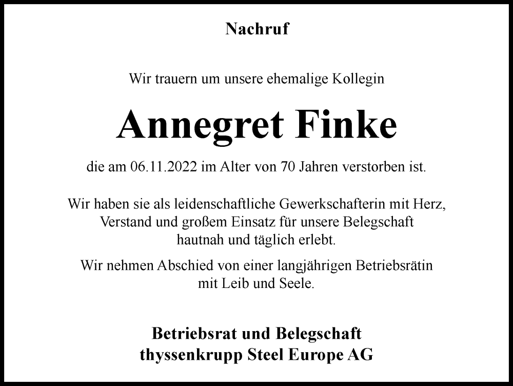 Hier finden Sie alle Traueranzeigen aus der Zeitung, die bisher für Annegret Finke erschienen sind. Weitere Traueranzeigen, die in der Zeitung erscheinen, werden hier ebenfalls aufgelistet
