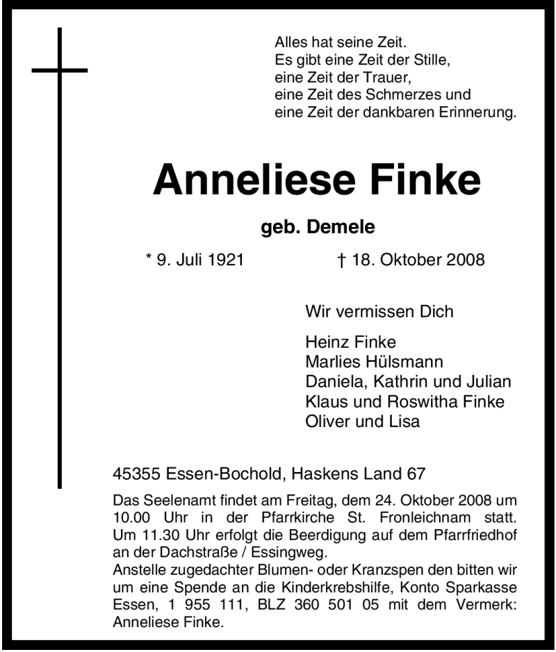Hier finden Sie alle Traueranzeigen aus der Zeitung, die bisher für Anneliese Finke erschienen sind. Weitere Traueranzeigen, die in der Zeitung erscheinen, werden hier ebenfalls aufgelistet