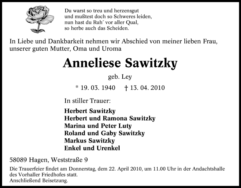 Hier finden Sie alle Traueranzeigen aus der Zeitung, die bisher für Anneliese Sawitzky erschienen sind. Weitere Traueranzeigen, die in der Zeitung erscheinen, werden hier ebenfalls aufgelistet