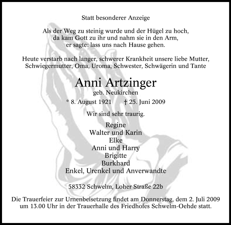 Pflanzen Sie einen Gedenkbaum für Anni Artzinger