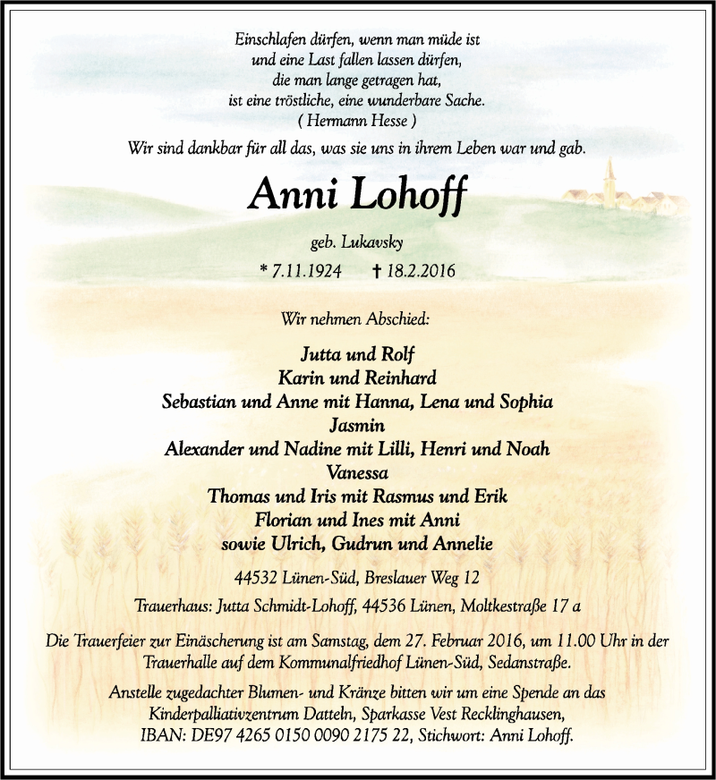 Hier finden Sie alle Traueranzeigen aus der Zeitung, die bisher für Anni Lohoff erschienen sind. Weitere Traueranzeigen, die in der Zeitung erscheinen, werden hier ebenfalls aufgelistet