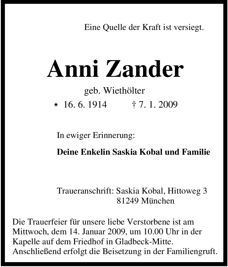 Hier finden Sie alle Traueranzeigen aus der Zeitung, die bisher für Anni Zander erschienen sind. Weitere Traueranzeigen, die in der Zeitung erscheinen, werden hier ebenfalls aufgelistet