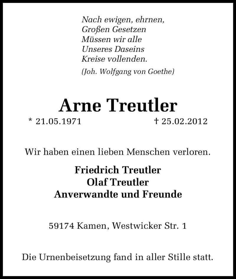 Hier finden Sie alle Traueranzeigen aus der Zeitung, die bisher für Arne Treutler erschienen sind. Weitere Traueranzeigen, die in der Zeitung erscheinen, werden hier ebenfalls aufgelistet