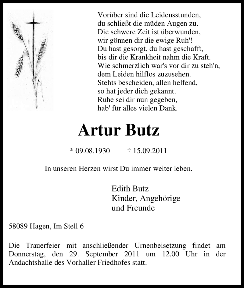 Hier finden Sie alle Traueranzeigen aus der Zeitung, die bisher für Artur Butz erschienen sind. Weitere Traueranzeigen, die in der Zeitung erscheinen, werden hier ebenfalls aufgelistet