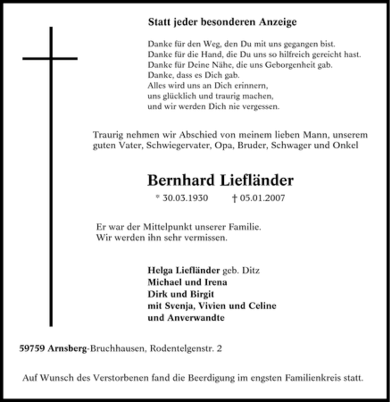 Hier finden Sie alle Traueranzeigen aus der Zeitung, die bisher für Bernhard Liefländer erschienen sind. Weitere Traueranzeigen, die in der Zeitung erscheinen, werden hier ebenfalls aufgelistet