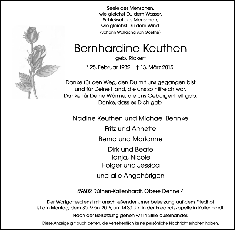 Hier finden Sie alle Traueranzeigen aus der Zeitung, die bisher für Bernhardine Keuthen erschienen sind. Weitere Traueranzeigen, die in der Zeitung erscheinen, werden hier ebenfalls aufgelistet