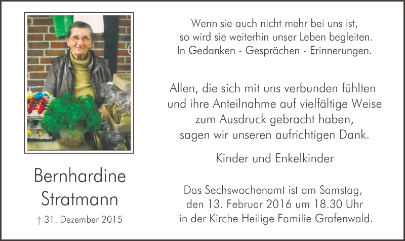 Hier finden Sie alle Traueranzeigen aus der Zeitung, die bisher für Bernhardine Stratmann erschienen sind. Weitere Traueranzeigen, die in der Zeitung erscheinen, werden hier ebenfalls aufgelistet