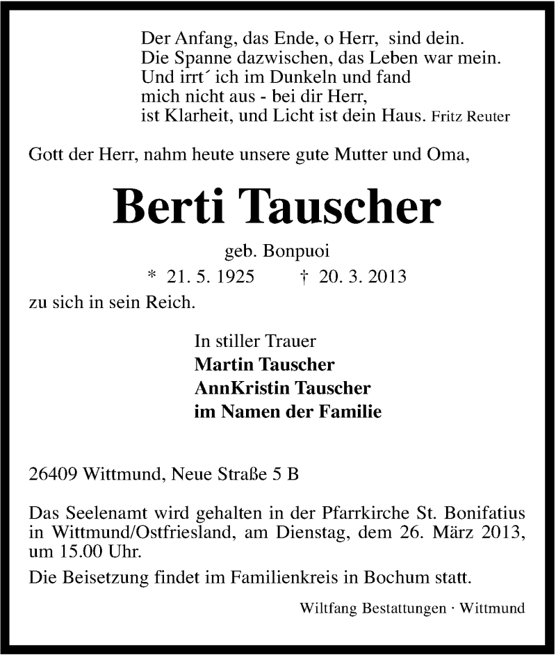 Pflanzen Sie einen Gedenkbaum für Berti Tauscher