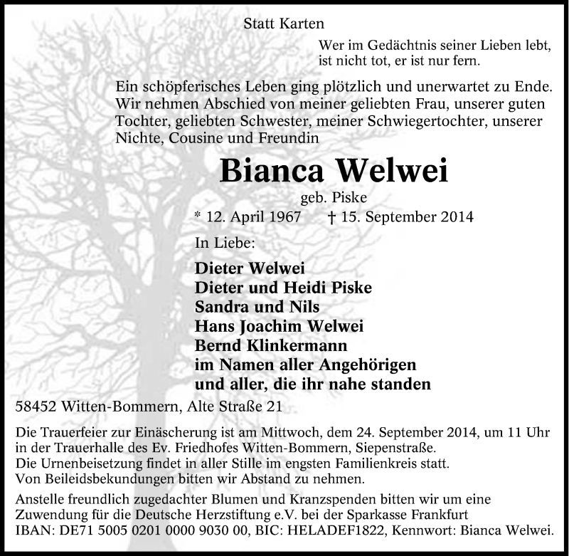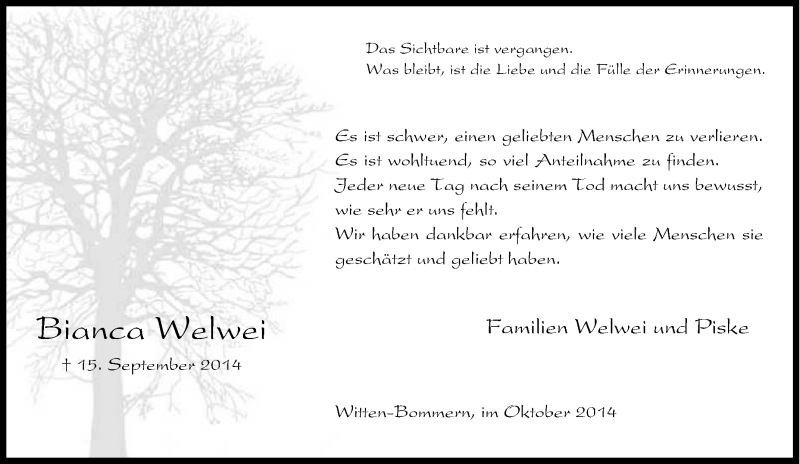 Pflanzen Sie einen Gedenkbaum für Bianca Welwei
