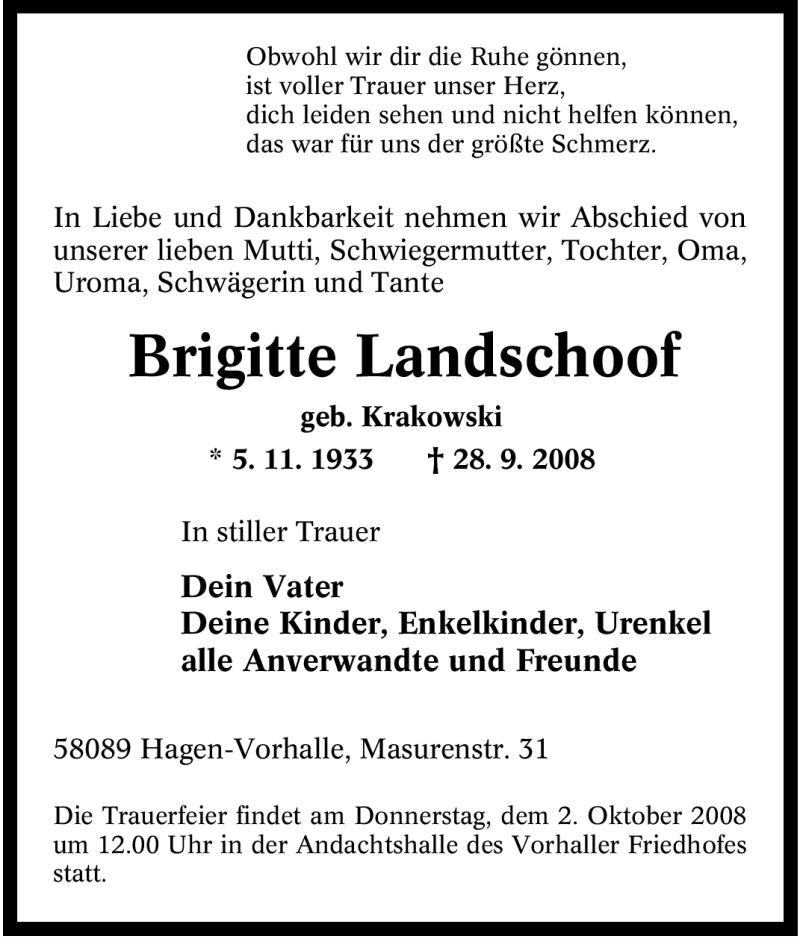 Hier finden Sie alle Traueranzeigen aus der Zeitung, die bisher für Brigitte Landschoof erschienen sind. Weitere Traueranzeigen, die in der Zeitung erscheinen, werden hier ebenfalls aufgelistet