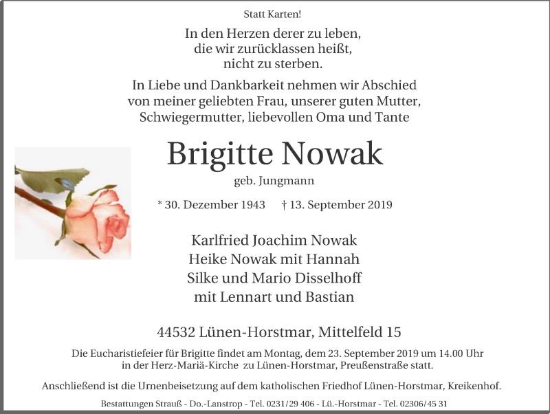 Hier finden Sie alle Traueranzeigen aus der Zeitung, die bisher für Brigitte Nowak erschienen sind. Weitere Traueranzeigen, die in der Zeitung erscheinen, werden hier ebenfalls aufgelistet