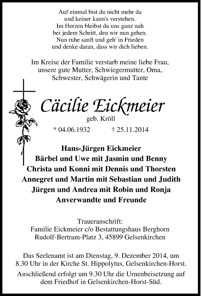 Hier finden Sie alle Traueranzeigen aus der Zeitung, die bisher für Cäcilie Eickmeier erschienen sind. Weitere Traueranzeigen, die in der Zeitung erscheinen, werden hier ebenfalls aufgelistet