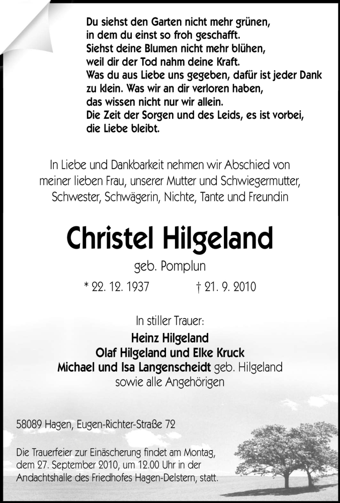 Hier finden Sie alle Traueranzeigen aus der Zeitung, die bisher für Christel Hilgeland erschienen sind. Weitere Traueranzeigen, die in der Zeitung erscheinen, werden hier ebenfalls aufgelistet