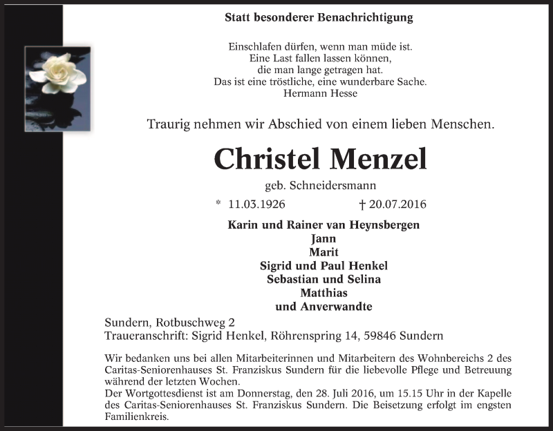 Hier finden Sie alle Traueranzeigen aus der Zeitung, die bisher für Christel Menzel erschienen sind. Weitere Traueranzeigen, die in der Zeitung erscheinen, werden hier ebenfalls aufgelistet
