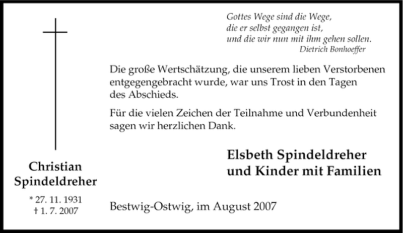 Hier finden Sie alle Traueranzeigen aus der Zeitung, die bisher für Christian Spindeldreher erschienen sind. Weitere Traueranzeigen, die in der Zeitung erscheinen, werden hier ebenfalls aufgelistet