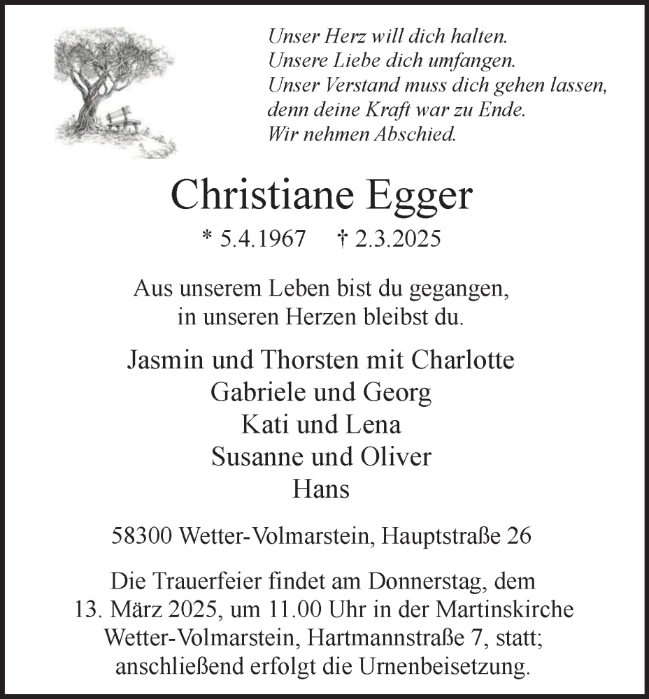 Hier finden Sie alle Traueranzeigen aus der Zeitung, die bisher für Christiane Egger erschienen sind. Weitere Traueranzeigen, die in der Zeitung erscheinen, werden hier ebenfalls aufgelistet