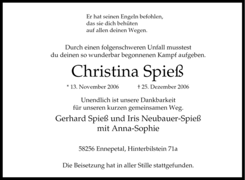 Hier finden Sie alle Traueranzeigen aus der Zeitung, die bisher für Christina Spieß erschienen sind. Weitere Traueranzeigen, die in der Zeitung erscheinen, werden hier ebenfalls aufgelistet