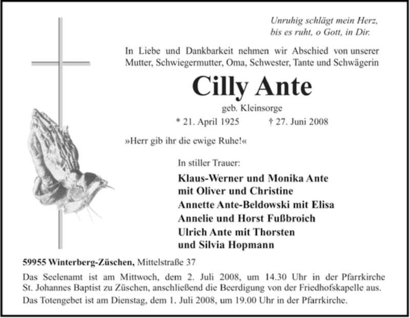 Hier finden Sie alle Traueranzeigen aus der Zeitung, die bisher für Cilly Ante erschienen sind. Weitere Traueranzeigen, die in der Zeitung erscheinen, werden hier ebenfalls aufgelistet