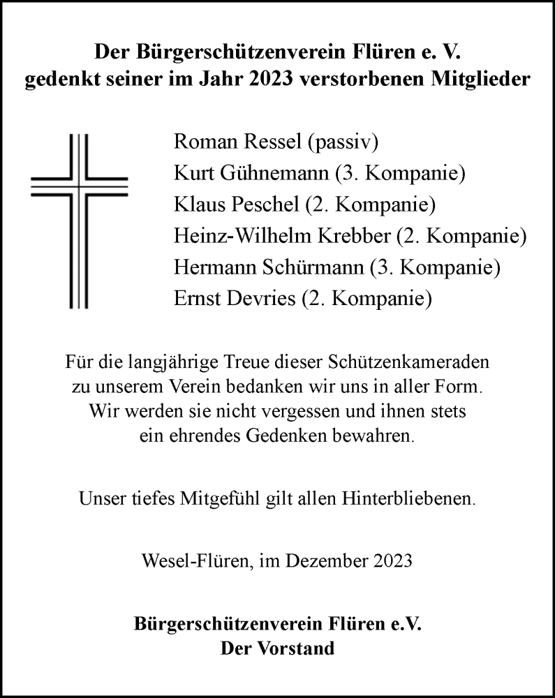 Hier finden Sie alle Traueranzeigen aus der Zeitung, die bisher für Der Bürgerschützenverein Flüren e. V. gedenkt seiner im Jahr 2023 verstorbenen Mitglieder erschienen sind. Weitere Traueranzeigen, die in der Zeitung erscheinen, werden hier ebenfalls aufgelistet