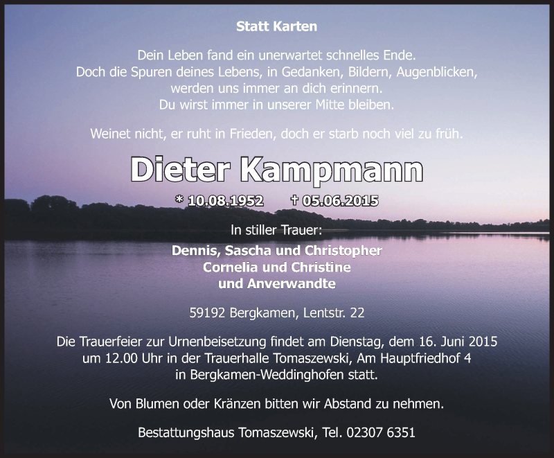 Hier finden Sie alle Traueranzeigen aus der Zeitung, die bisher für Dieter Kampmann erschienen sind. Weitere Traueranzeigen, die in der Zeitung erscheinen, werden hier ebenfalls aufgelistet