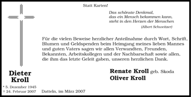 Hier finden Sie alle Traueranzeigen aus der Zeitung, die bisher für Dieter Kroll erschienen sind. Weitere Traueranzeigen, die in der Zeitung erscheinen, werden hier ebenfalls aufgelistet