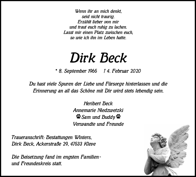 Hier finden Sie alle Traueranzeigen aus der Zeitung, die bisher für Dirk Beck erschienen sind. Weitere Traueranzeigen, die in der Zeitung erscheinen, werden hier ebenfalls aufgelistet