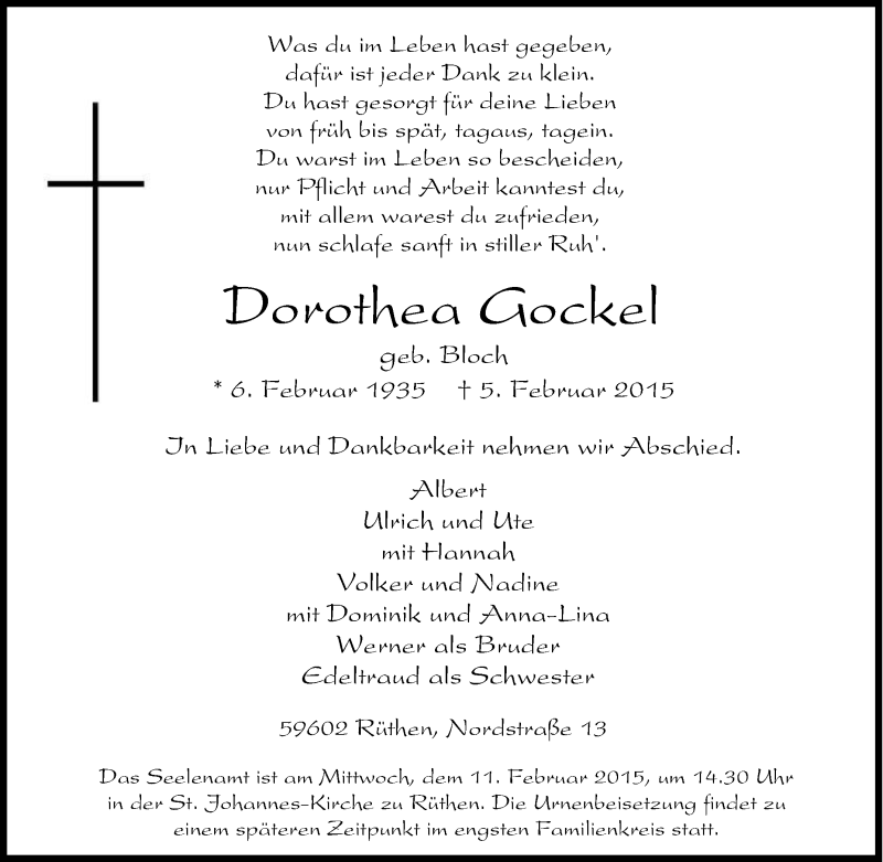 Hier finden Sie alle Traueranzeigen aus der Zeitung, die bisher für Dorothea Gockel erschienen sind. Weitere Traueranzeigen, die in der Zeitung erscheinen, werden hier ebenfalls aufgelistet