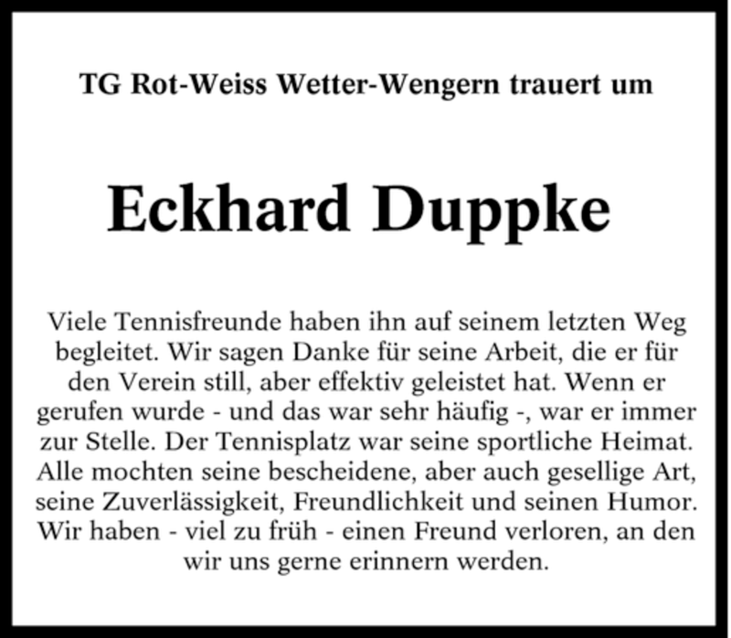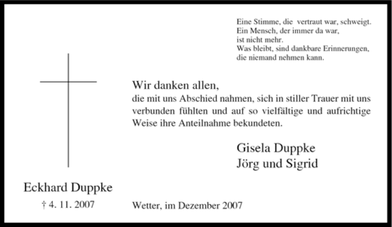 Hier finden Sie alle Traueranzeigen aus der Zeitung, die bisher für Eckhard Duppke erschienen sind. Weitere Traueranzeigen, die in der Zeitung erscheinen, werden hier ebenfalls aufgelistet