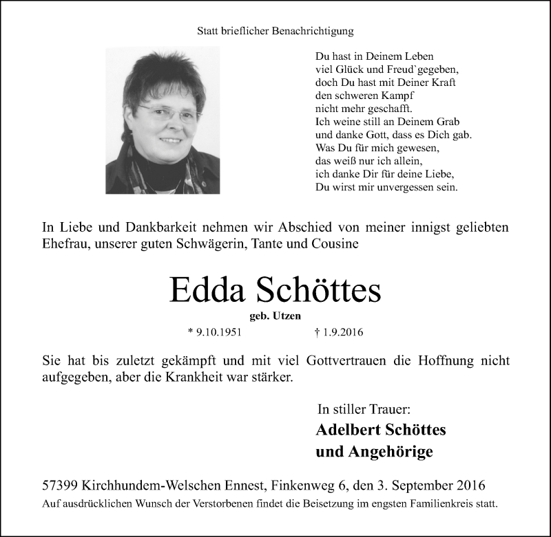 Hier finden Sie alle Traueranzeigen aus der Zeitung, die bisher für Edda Schöttes erschienen sind. Weitere Traueranzeigen, die in der Zeitung erscheinen, werden hier ebenfalls aufgelistet