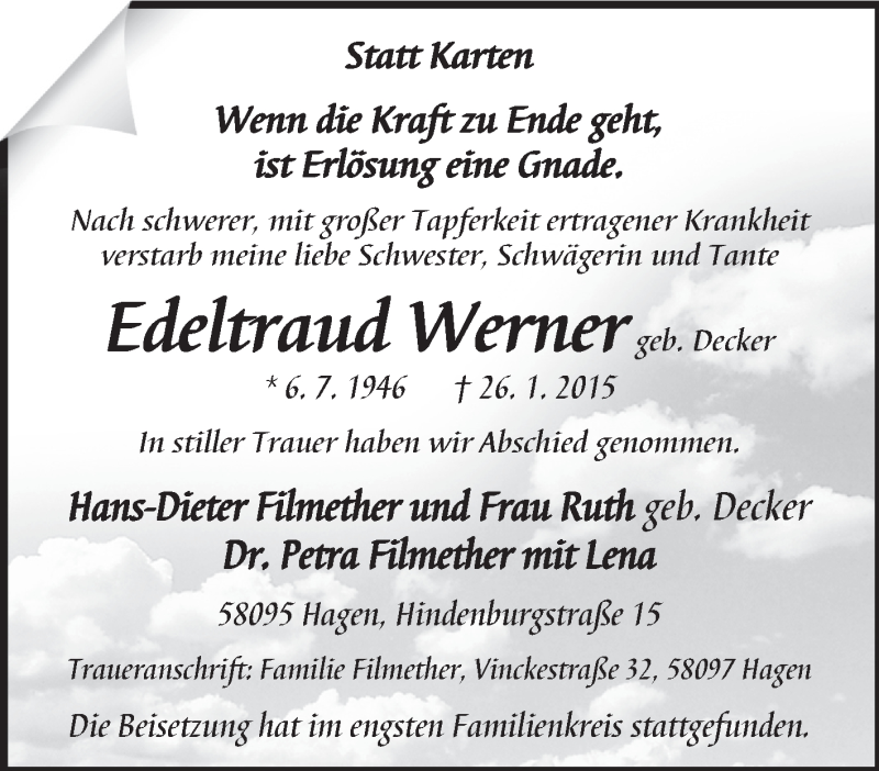 Hier finden Sie alle Traueranzeigen aus der Zeitung, die bisher für Edeltraud Werner erschienen sind. Weitere Traueranzeigen, die in der Zeitung erscheinen, werden hier ebenfalls aufgelistet