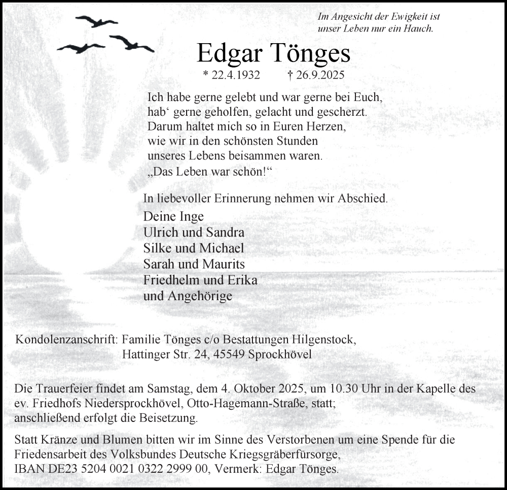 Hier finden Sie alle Traueranzeigen aus der Zeitung, die bisher für Edgar Tönges erschienen sind. Weitere Traueranzeigen, die in der Zeitung erscheinen, werden hier ebenfalls aufgelistet