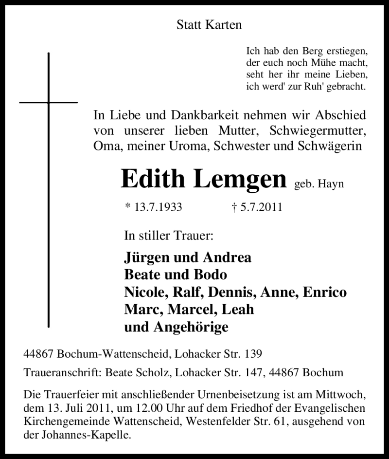 Hier finden Sie alle Traueranzeigen aus der Zeitung, die bisher für Edith Lemgen erschienen sind. Weitere Traueranzeigen, die in der Zeitung erscheinen, werden hier ebenfalls aufgelistet