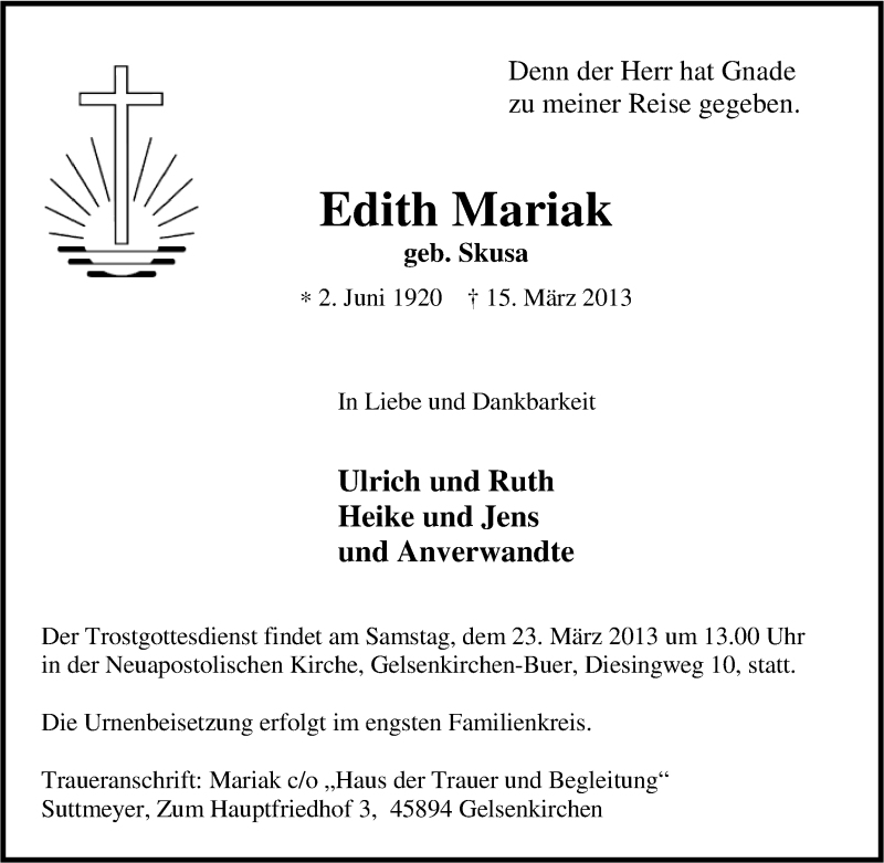 Hier finden Sie alle Traueranzeigen aus der Zeitung, die bisher für Edith Mariak erschienen sind. Weitere Traueranzeigen, die in der Zeitung erscheinen, werden hier ebenfalls aufgelistet