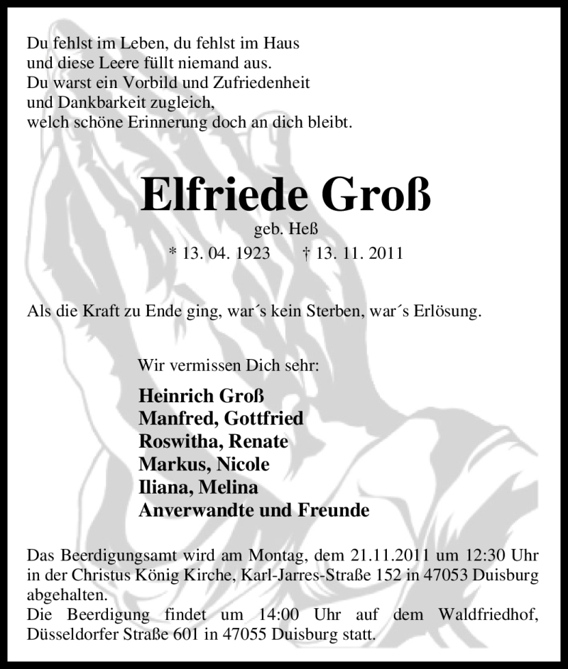 Hier finden Sie alle Traueranzeigen aus der Zeitung, die bisher für Elfriede Groß erschienen sind. Weitere Traueranzeigen, die in der Zeitung erscheinen, werden hier ebenfalls aufgelistet