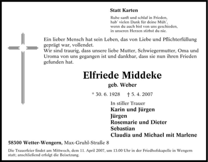 Hier finden Sie alle Traueranzeigen aus der Zeitung, die bisher für Elfriede Middeke erschienen sind. Weitere Traueranzeigen, die in der Zeitung erscheinen, werden hier ebenfalls aufgelistet