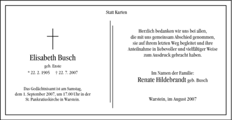 Hier finden Sie alle Traueranzeigen aus der Zeitung, die bisher für Elisabeth Busch erschienen sind. Weitere Traueranzeigen, die in der Zeitung erscheinen, werden hier ebenfalls aufgelistet